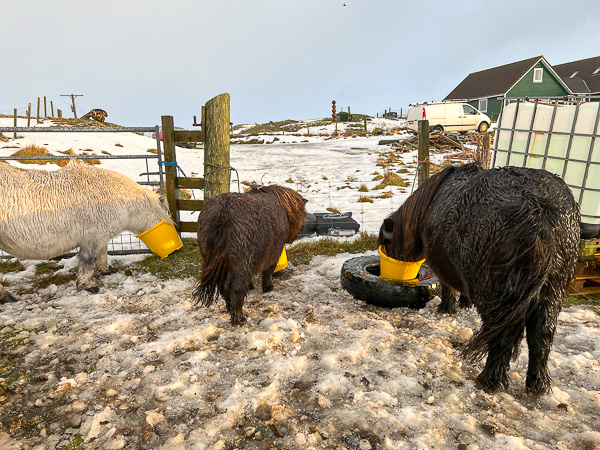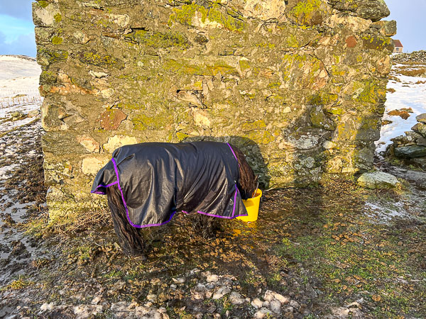 One of my huge worries was Waffle. We managed to drive over daily (somehow with many prayers – it was very scary) to see the ponies taking food to warm them up. Waffle was always shaking and soaked to the skin so I took a rug with me and that helped hugely.